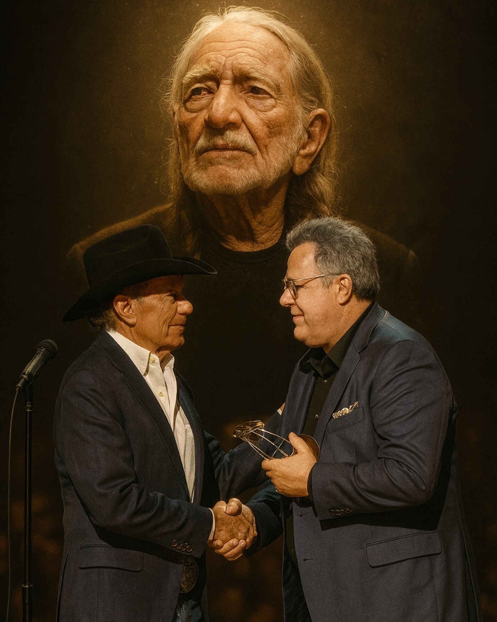 Moments later, a soft instrumental of “Blue Eyes Crying in the Rain” floated through the speakers, and the crowd rose to its feet—not for Vince, not for George, but for Willie Nelson watching from his home in Texas.