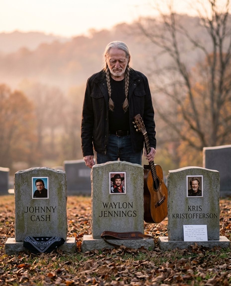 The image is almost impossible not to linger on: Willie Nelson arriving alone, carrying a guitar, walking slowly over the grass, and lowering himself to the ground in front of each stone. No entourage. No spotlight. No crowd standing back with phones in the air. Just the final Highwayman and the silence that follows a lifetime of applause.
