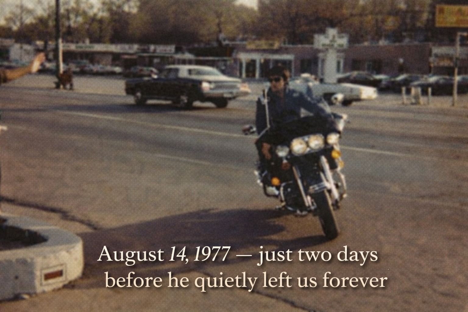 The image shows him moving through the city, alone with his thoughts. There is no performance, no spotlight, only the road ahead and memories behind him. No one who saw him that day could have known how little time remained. To passersby, it was simply Elvis on his motorcycle. To history, it would become one of the final glimpses of him still living, still moving, still holding on.