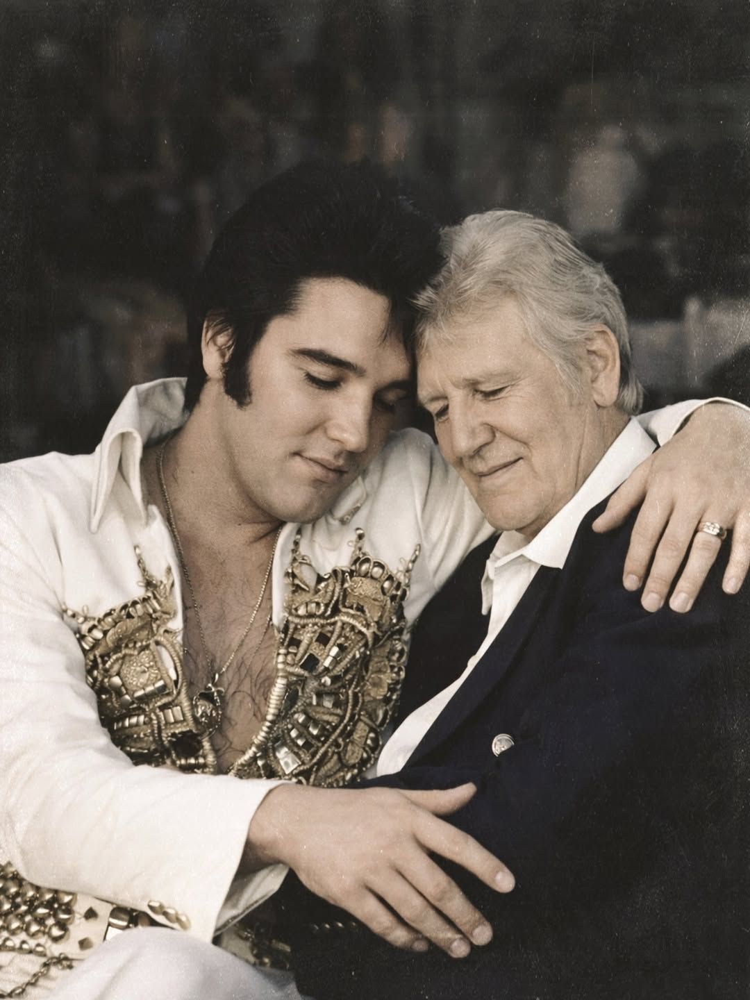 Elvis Presley and his father, Vernon Presley, shared one final moment frozen in time on a warm June night in 1977. The last photograph ever taken of them together shows two figures standing close, as if instinctively holding on. Vernon’s expression is filled with quiet pride, while Elvis looks tired yet gentle, carrying the weight of the world and the comfort of his father’s presence all at once. It is not a picture of fame or spectacle. It is a farewell without words, captured before anyone knew it would be the last.