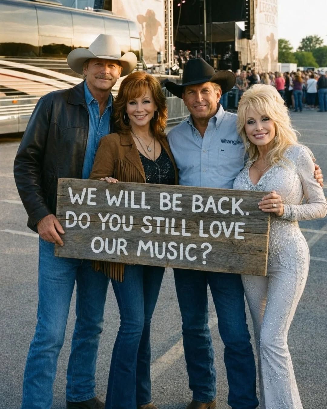 George’s voice carried that familiar high-plains steadiness, clear and unhurried, like a man who knows exactly who he is. Alan’s tone settled in beside it, warm and grounded, the sound of stories told without rushing the ending. Reba brought precision and strength, her phrasing sharp but never cold, each line landing where it needed to. And Dolly — soft, knowing, full of light — wrapped it all together with a warmth that felt more like reassurance than performance.