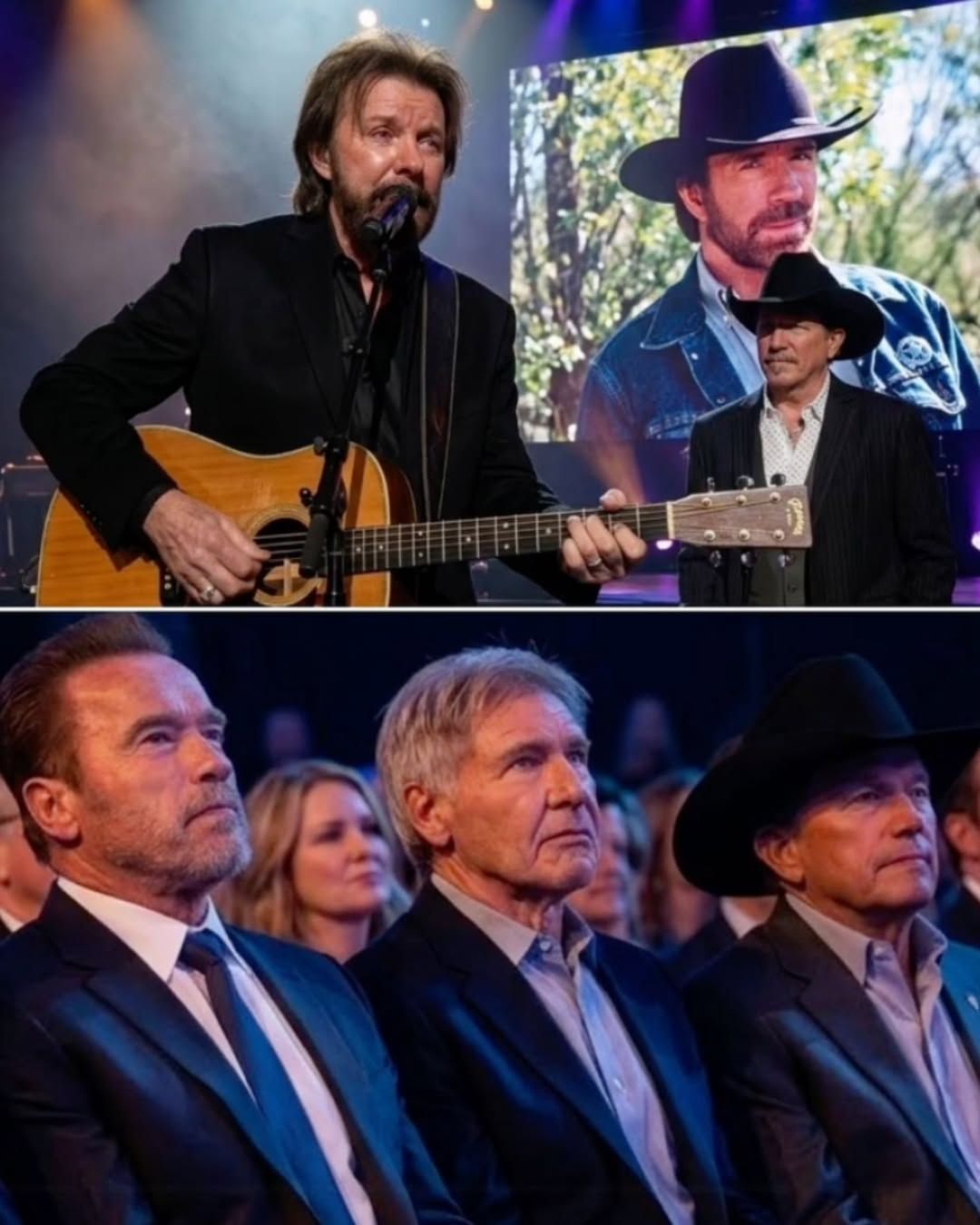 Not with screaming. Not with celebration. With something rarer. With shared feeling. With grief, respect, love, and awe all tangled together in the same breath. Sylvester Stallone turned away for a second. Arnold Schwarzenegger closed his eyes. George Strait no longer tried to hide the emotion on his face.