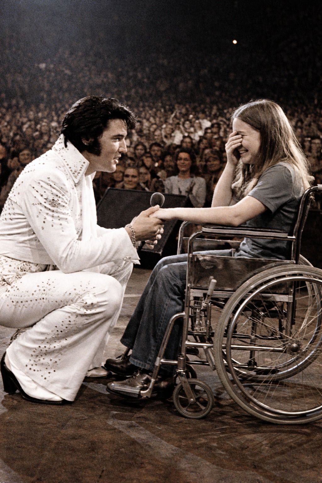 Elvis leaned toward the edge of the stage, concern replacing showmanship. Into the microphone, he asked three quiet words that rippled louder than any chorus: “Can she see?” The arena fell into instant silence. Security guards moved swiftly. Within moments, stagehands cleared space and gently guided Sarah to a position where the stage rose clear before her. Elvis waited, watching carefully, refusing to resume until he was sure. When she nodded, overwhelmed and tearful, he smiled and said, “Well, honey, this one’s for you,” before launching back into the song with even greater fire.