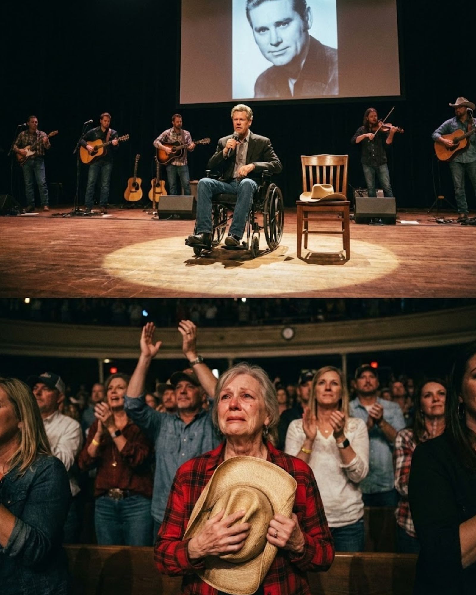 At the very edge of the stage, sitting quietly in a wheelchair, was another titan: Randy Travis.