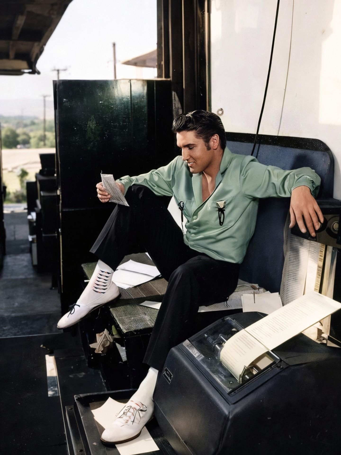 The room seemed to change when Riley revealed Elvis’s personal travel case, the one her family had always called his black box. Worn by years of use, it held the small objects he kept close wherever he went. Inside were his American Express card, a simple comb with strands of his hair still caught in its teeth, a compact Polaroid camera, and a Bible from 1957 filled with his handwriting. As Riley held each item, Elvis felt suddenly near. Not as an icon or a voice on the radio, but as a man who found comfort in familiar things, who carried faith and memory in his hands while the world asked everything of him.