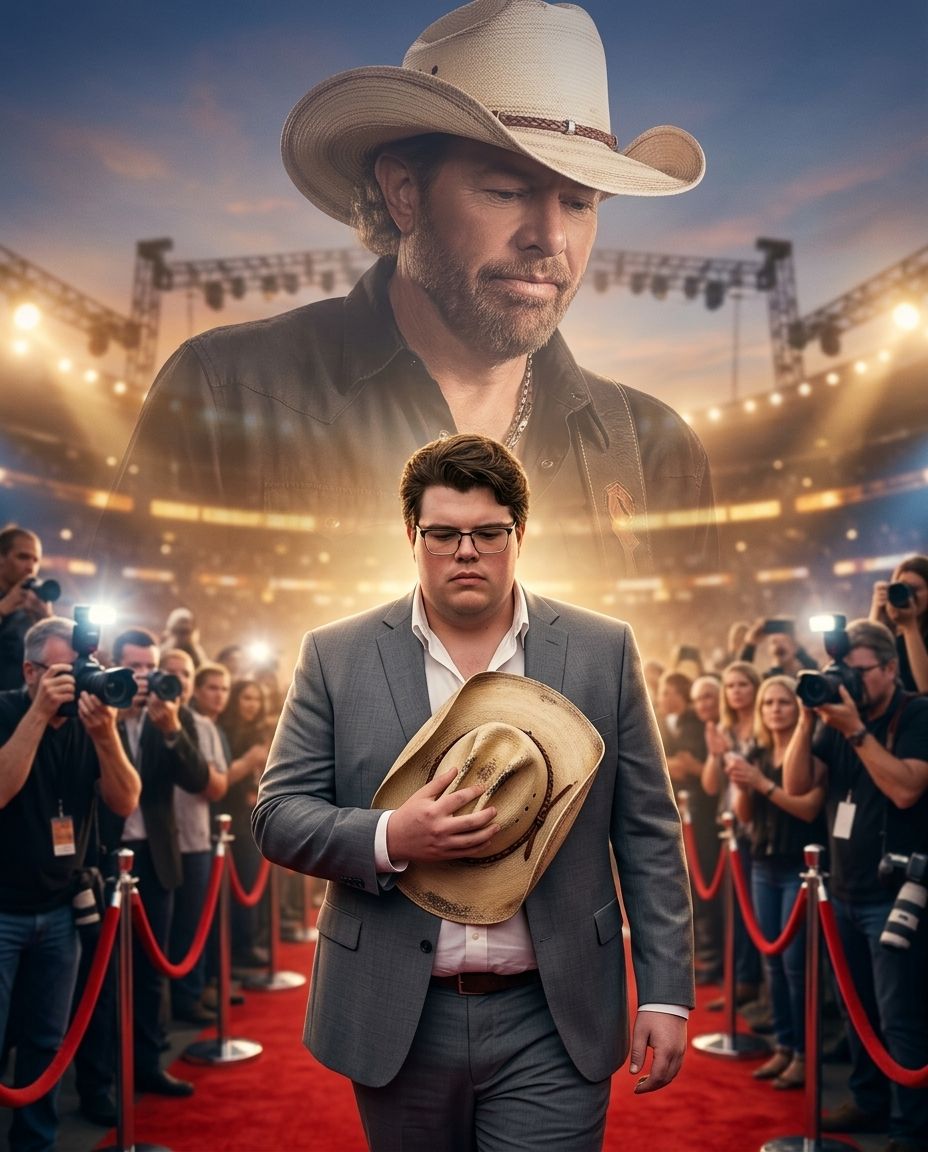In the story that has spread from fan to fan, Stelen Keith Covel walks the red carpet alone, holding Toby Keith’s battered cowboy hat against his chest like it still carries heat from the man who wore it. No wave. No grin for the cameras. No effort to turn heartbreak into something polished. Just a tight jaw, a fixed stare, and the kind of posture that says a person is trying to hold steady because falling apart in public is simply not an option.