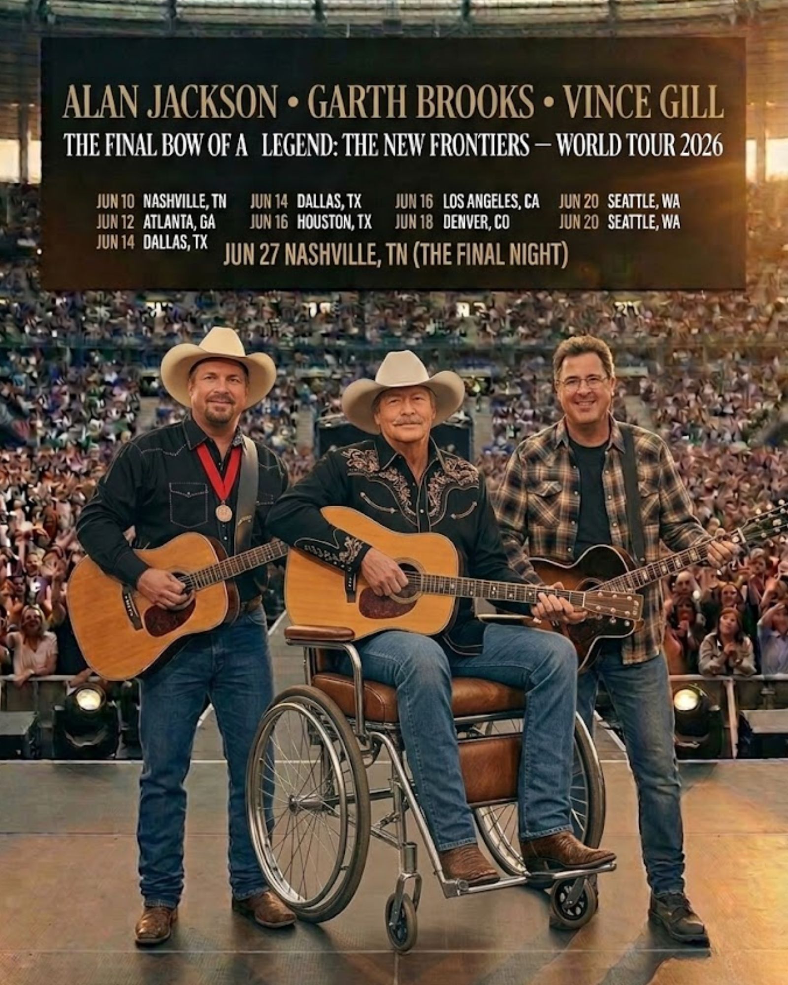 Garth Brooks has always understood spectacle, but he’s also understood heart. Vince Gill has always carried the kind of musicianship that feels like comfort in a hard moment. Put them beside Alan Jackson, and suddenly The New Frontiers sounds less like a tour title and more like a promise: we are going to do this together.