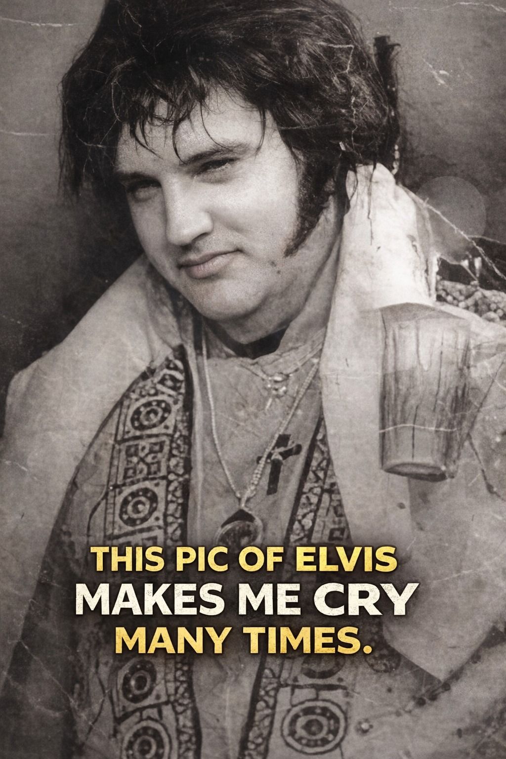 This picture of Elvis Presley makes me cry more than I can explain. It is not just an image. It is a moment frozen in time, taken during the final concert of his life in June 1977. At first glance, you still see The King. The white jumpsuit, the stage lights, the presence that once shook the world. But if you look a little longer, you begin to see something deeper.