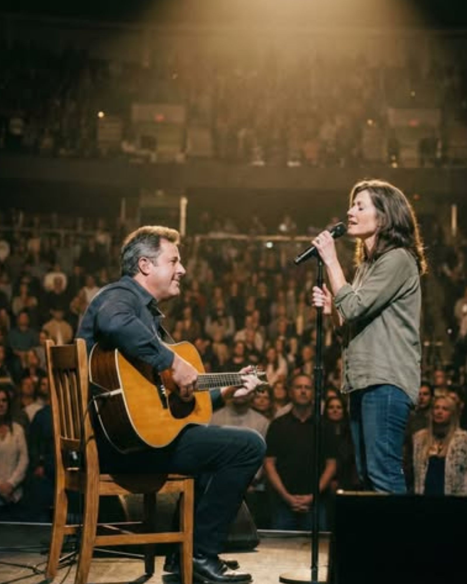 There was no announcement to prepare the audience. No dramatic pause designed for applause. Just the quiet scrape of a chair on the floor, one acoustic guitar settling into place, and a silence that suddenly felt full instead of empty. The kind of silence that makes people lean forward without realizing it.