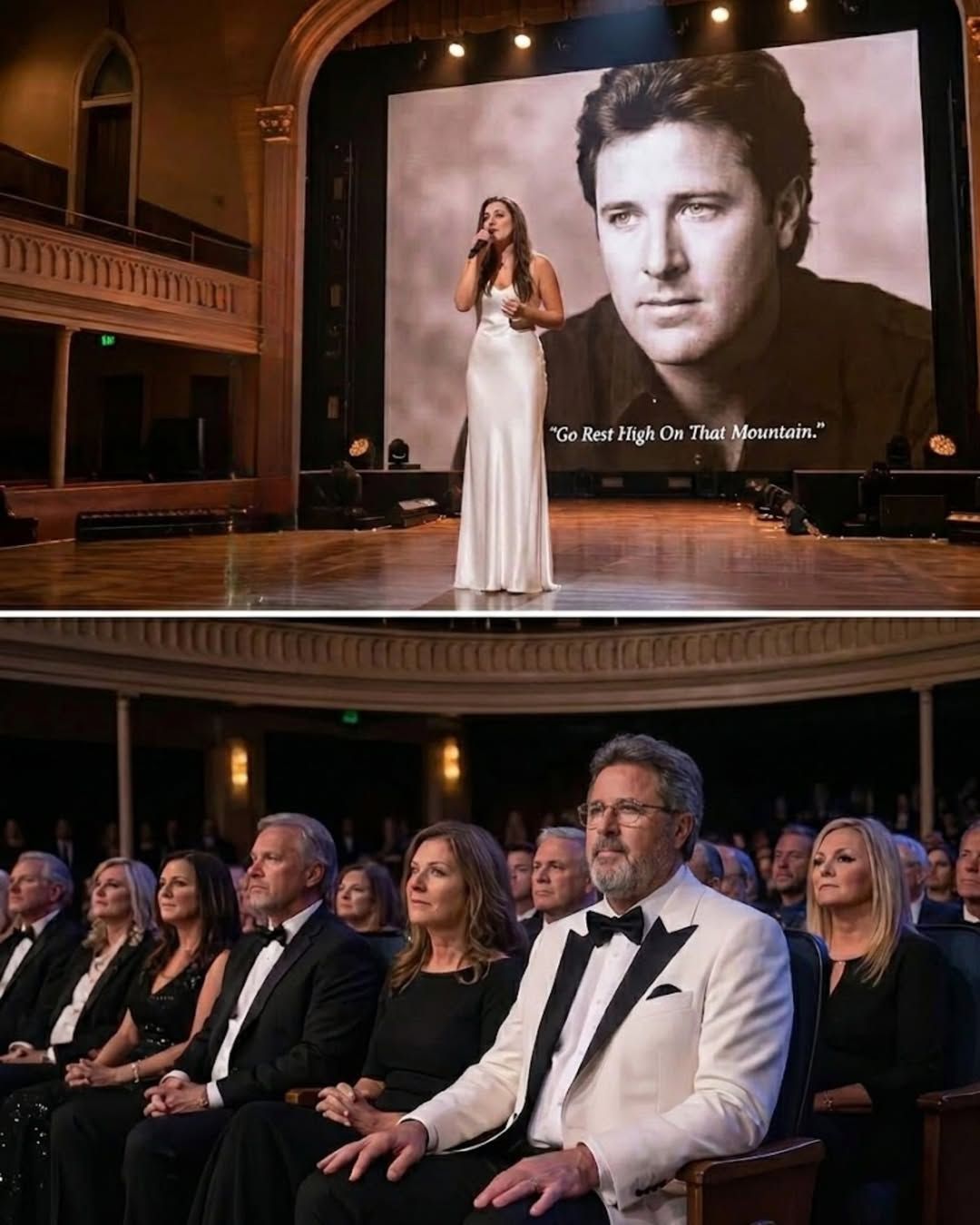 When the first notes of “Go Rest High on That Mountain” began, the reaction wasn’t loud. It wasn’t even immediate. It was a quiet shift, like the entire crowd recognized the weight of what was coming and decided, together, not to interrupt it.
