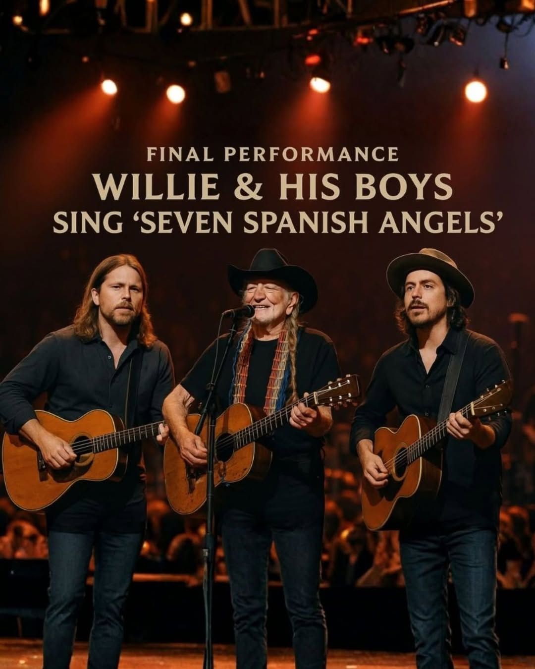 Some performances don’t feel like concerts—they feel like history reaching out and placing a hand over your heart. That’s exactly what happened the night Willie Nelson took the stage with his sons, Lukas and Micah, to sing “Seven Spanish Angels” in what has already become one of the most unforgettable, soul-shaking farewells country music has ever witnessed.
